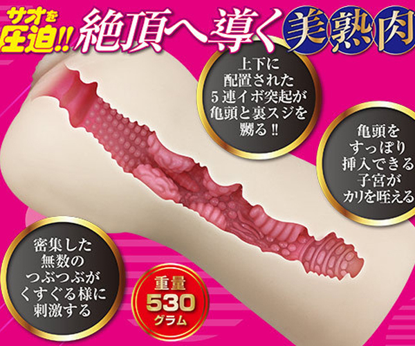 年上淫乱妻の豊満ボディを忠実に再現!肉感溢れる重量530gの肉厚オナホ(非貫通)。とろけるようなまったり感がサオ全体に絡みつき、上下に施された大きな5連イボ突起で絶頂へと導く♪肉欲に溺れた美熟女と濃密濃厚な時間をこの生膣オナホでぜひ。