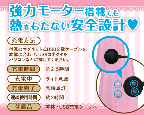 スレンダー美人なグラドルAV女優「吉高寧々」も身悶えたキュートなピンクカラーのUSB充電式電マ。出っ張った先端がピンポイント刺激に対応!クリや乳首を責めると同時に周囲までしっかり振動を伝えます。素材には柔らかなシリコンを採用、振動は5種類のパターンと3段階強弱を搭載!超強力モーターが生み出す快感を貴方も体験しよう♪完全防水、2.5時間充電で2時間連続稼働