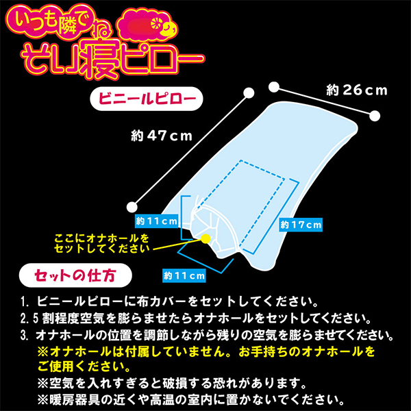 ふりふり腰振り!和服姿に半裸がエッチな「いつも隣でそい寝ピロー 大和なでしこな彼女ばーじょん」。ちょっぴり赤らんだ頬が可愛らしい大和なでしこな彼女との添い寝ができる、人気の添い寝ピローシリーズの新作です♪イラスト入りの専用布カバーとホールポケット付きのピローがセット!ちょうどいい大きさの専用布カバーの穴にお気に入りのホールをセットすれば大興奮がさらにテンションMAX♪表面は正常位、裏面は後輩位とそれぞれ違った体位が楽しめ腰フリオナニーが楽しめる!ホールポケットはミドルサイズでピローサイズは平均的な枕の大きさ。小さめのオナホの場合はタオルなどを巻いて調整してお使いいただけます♪ホールをセットする際は5割程度膨らませた状態で位置などを調整しながら空気を注入してください。※こちらの商品にオナホールは付属していません。別途、お買い求めの上ご使用下さい。