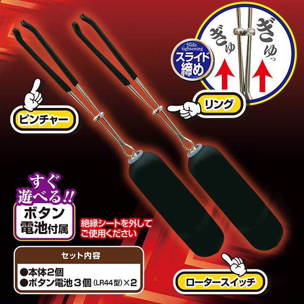 痛みと振動で乳首イキ!!!挟んで!震えて!重みで!乳首がビビビビン!!!アッ、乳首がとれちゃいそう…!!!!シンプルに乳首責めを楽しむアイテムです。振動は楽しめる10パターン。ブルブルイジメちゃおッ!!!STEP1.ピンチャーで乳首を摘み、2.リングでしっかりと締め上げ、3.ローターのスイッチをON!でプレイスタート!!!!※ご使用の際はローターの蓋をしっかりと閉めてから電源を入れてください。