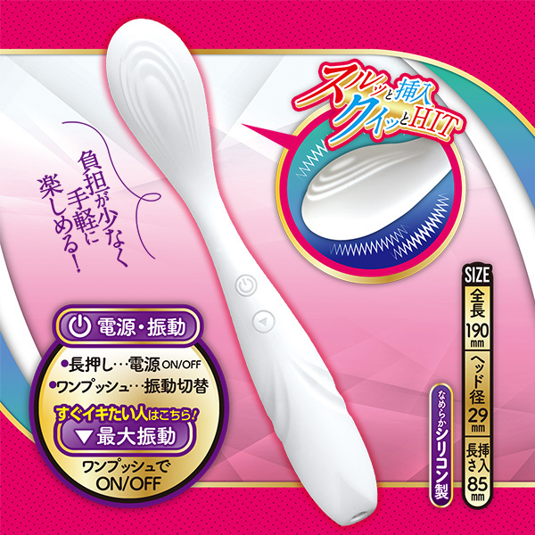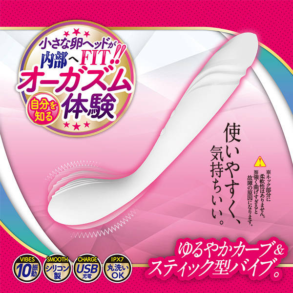 使いやすく、気持ちいい。スルッと挿入、クイッとHIT!自分を知るオーガズム体験!気持ちいい場所へ届きやすい、ゆるやかカーブ&スティック型バイブ。小さな卵ヘッドが内部へFIT!ヘッドの凸凹ミゾでグッと押したり、擦ったり、掻き出したり。膣内だけでなく、全身やクリトリスへ、愛撫のように沿わせるように使っても◎触り心地はなめらかなシリコン製。スタイリッシュなデザインなので、お部屋でも違和感がありません。高水準の防水レベル「IPX7」なので、丸洗いでき、お風呂でも使用もOK。ぐっしょり濡れてもOK♪♪♪♪♪好きな場所を好きなだけ気持ちよく。快感に正直になろう。■充電時間:約120分/連続使用時間:約60分(使用状況や環境により時間が変わる場合があります)。・10パターン振動・防水レベルIPX7・シリコン製・USB充電式※ネック部分に柔軟性はありません、強く曲げすぎると故障の原因になります。