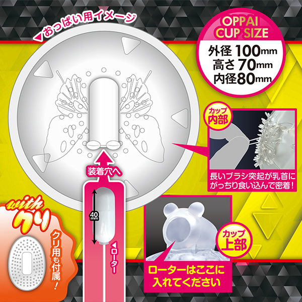 パッケージ:16.8×22.3×7.0cm 本体:オッパイカップ(外径10.0cm・内径8.0cm・高さ7.0cm)、クリカップ(全長10.0cm・横幅6.0cm・高さ5.0cm)、コントローラー全長8.6cm、コード長86cm 原産国:中国 材質:ABS、TPE 重量:200g
