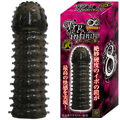 最高の快感を体験!オールカバータイプのペニスサック「トライインフィニティ 武」。無数のイボイボ鎧を纏ったその姿は、見るからに刺激的!素材には高品質エラストマーを使用し、絶妙な硬度に仕上げられています。次から次へと巻き起こる絶頂快感で、パートナーも大満足のペニス増強グッズです。最強の鎧を纏って絶倫プレイにチャレンジしましょう。