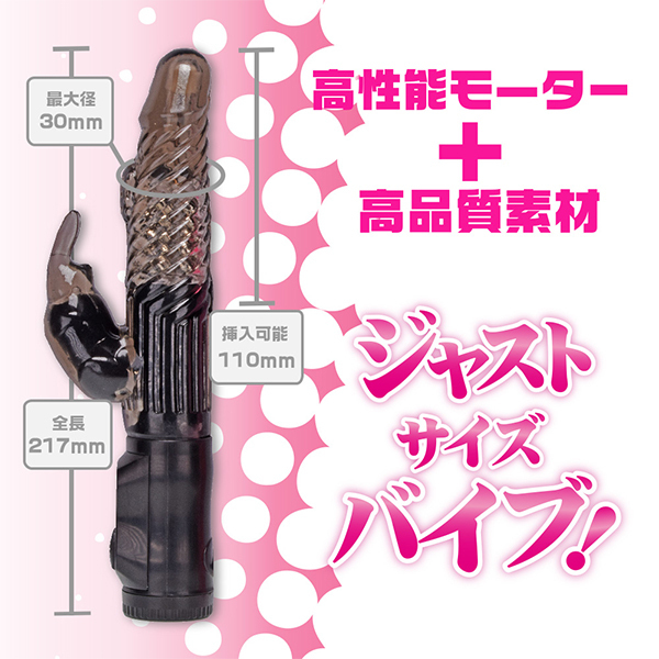 ハイパワースイング&サブバイブ振動にストレス臭カットの高品質TPE素材採用のジャストサイズバイブ登場。最大径30mmのジャストフィット形状に挿入部から約50mmの部分に絶妙に配置されたGス●ットしげき突起を配置・グルグル刺激するパール回転アクションも搭載。使い易いみんなのスタンダードバイブ。カラー:ブラック