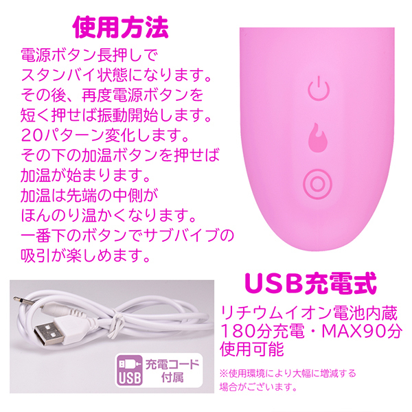 もうセックスしなくて良い気持ち良さ!中イキした事ない人にもおススメ!滑らかな触り心地と柔らかさの高品質シリコンボディにUSB充電式リチウムイオン電池による絶妙振動アクションとサブバイブによる吸引機能、さらに先端部の加温機能まで搭載した高性能バイブ。滑らかで使いやすい形状が驚くほど満足感を演出します。静音設計・生活防水機能搭載。●カラー:ピンク