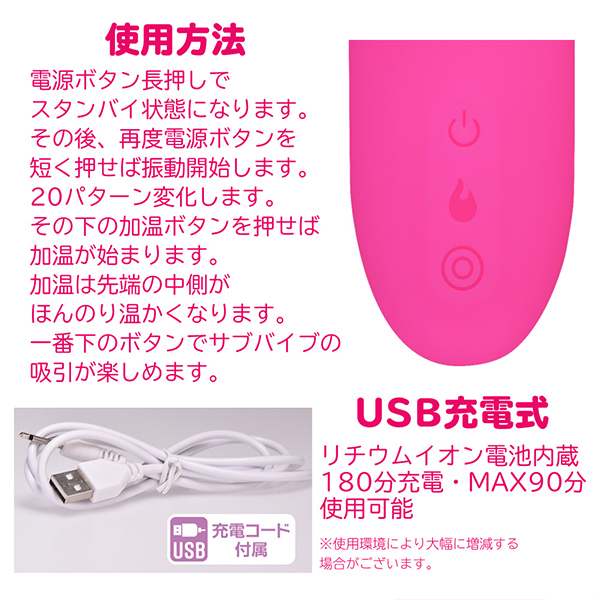 もうセックスしなくて良い気持ち良さ!中イキした事ない人にもおススメ!滑らかな触り心地と柔らかさの高品質シリコンボディにUSB充電式リチウムイオン電池による絶妙振動アクションとサブバイブによる吸引機能、さらに先端部の加温機能まで搭載した高性能バイブ。滑らかで使いやすい形状が驚くほど満足感を演出します。静音設計・生活防水機能搭載。●カラー:ローズ