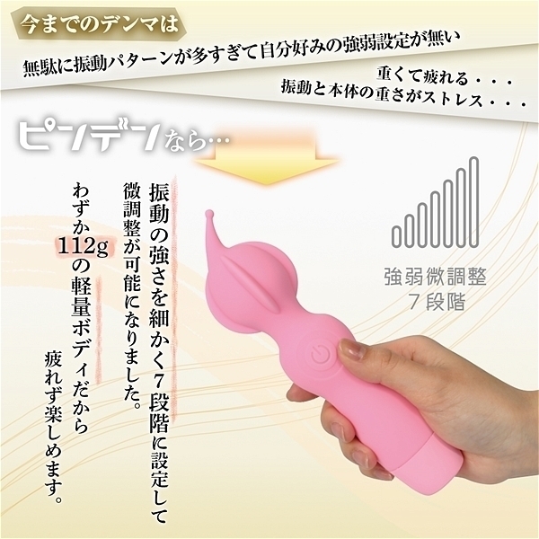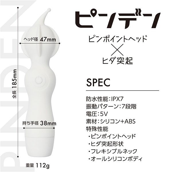 ピンポイントヘッド・ヒダ突起付の完全防水シリコンデンマです。上質振動の強力モーター搭載・高品質シリコンボディ・フレキシブルネックの上級性能に加えてピンポイントを強力刺激出来る先端突起と割れ目に入れて楽しめるヒダ突起形状をプラスしました。振動も一般的なパターン振動では無く、こだわりの強弱微調整可能な7段階振動です。もちろん普通のデンマスタイルも可能なので色々な楽しみ方が出来ます。しかもIPX7の完全防水性能だから使い勝手もバツグンです。90分満充電で60分使用可能(使用環境により大幅に増減します)なリチウムイオン電池内蔵。パワフルなのに繊細な使い方も楽しめるデンマです。●カラー:ホワイト