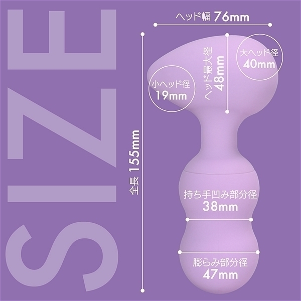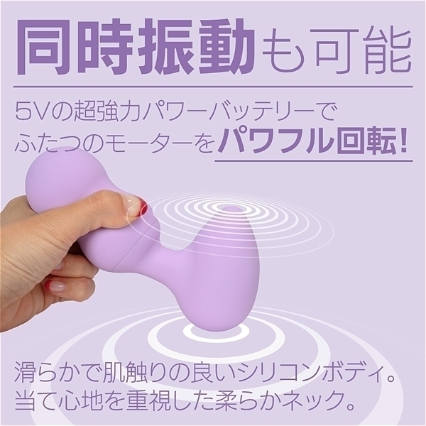 エッグ型ヘッドの左右に大小、サイズの違うモーターを配置!小ヘッドにはピンポイント用に微細振動モーターでポイント刺激を楽しめます。大ヘッドには重振動の大型モーターを搭載してデンマのダイナミックな振動を体感出来ます。電圧5Vの強力振動+高品質なオールシリコンボディだから触り心地も非常に滑らかで防水性能も完全防水を実現(防水等級IPX7)当て心地の良さを上げるフレキシブルネックの反発度にもこだわった絶品デンマです。さらに二つのモーターを個別操作出来るのでお好みに合わせて色々な楽しみ方が出来ます。もちろん同時振動も可能なので共に最強振動にした時のパワーは圧巻です。強弱も5段階に微調整が出来るので振動の好みに合わせて楽しめます。さらに5つのパターン振動も内蔵。満充電120分で最大60分使用可能。(使用環境により大幅に増減します。)●カラー:パープル