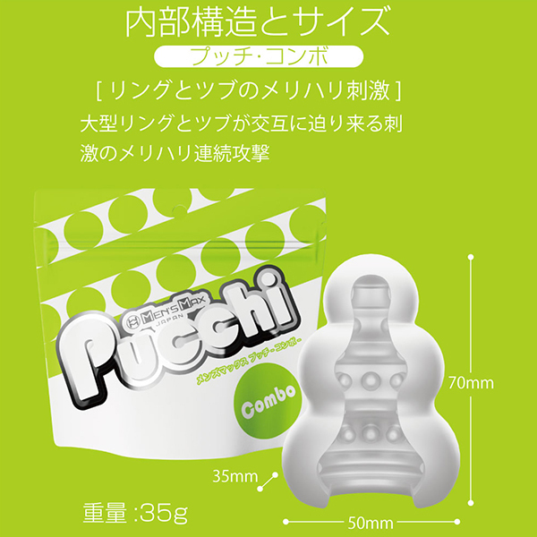 全てが新しくなったプッチ。ポケットサイズのローション不要ホールプッチシリーズが生まれ変わって新登場。軟性素材から内部の構造、パッケージ、全てが新しくなりました。デコボコ感、さらにクッキリ。今回新たに導入した「HD(High Definition)成形」で突起のデコボコ感がさらにクッキリになりました。突起に触れたときの粒立ちが違います。弾力感、さらにモッチリ。「HD 成形」により軟性樹脂の弾力性も向上。さらにモッチモチに、しなやかな素材になりました。内部構造も、さらにハッキリ。オリジナルシリーズ、スイーツシリーズ計8種類の内部構造をより精密な造形にリニューアル。「HD 成形」とあいまってデコボコ感がよりハッキリわかる構造になりました。生産工場を一新。新型プッチシリーズは日本国内に新設した工場から生産。最新の設備と厳密な品質管理で一つ一つ丁寧に作ります。ローション不要、必要なのは水だけ。ローション不要軟性素材「プラスウェッチ」水分が付着すると潤い成分が反応、ねっとりした潤いに包まれます。<コンボ内部構造>「リングとツブのメリハリ刺激」大型リングとツブが交互に迫り来る刺激のメリハリ連続攻撃