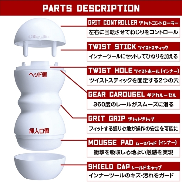 グリットコントローラーは右にも左にもツイスト可能。右と左のひねる方向で内部構造も変化する!お好みのひねり具合で吸着感をコントロール!挿入口のキャップを外しローションを入れて挿入。グリットコントローラーを右に左にねじって刺激の変化を体感せよ。インナーは丸洗い可能。各パーツを取り外し、洗浄・乾燥が終わったら組立てて再び使用可能。アウターケースは耐久性に優れ表面のマット仕上げとフォルムで安心のグリップ感。インナーは約250gで単体のみでの使用も可能なずっしりサイズ。ポケットローション(7ml)付属。グリットコントローラーに付いたスプリングボールとギアカルーセルがかみ合いスムーズな操作性を実現。グリットコントローラーは右にも左にも回せます、右と左のひねる方向で内部構造も変化する!お好みのひねり具合で吸着感をコントロール!<内部構造>@バウンスビーズ 弾力感のある大型ビーズAボーンビーズ 背骨のように連なった縦型極小ビーズBフラップビーズ 斜めに突き出すフラップ型ビーズ
