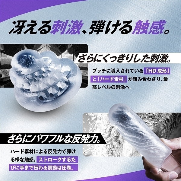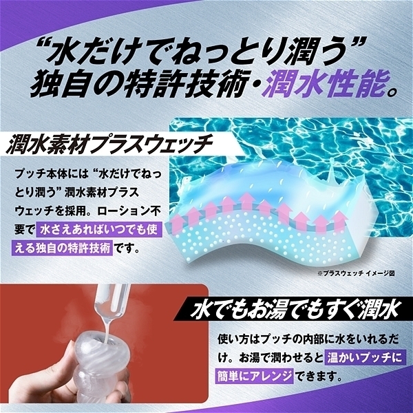 プラスウェッチは独自開発の新素材。水をつけて軽く擦ることで内部の超ミクロサイズで閉じ込められた「潤いゼリー」が水に反応し、沁みだし樹脂表面をねっとりと潤い包みこみます。<デコボコ感さらにクッキリ。>「HD(High Definition)成形」で突起のデコボコ感がさらにクッキリになりました。突起に触れたときの粒立ちが違います。<ウェーブ内部構造>「連続で打ち寄せる触感の波」ウェーブ状のヒダが絶え間なく打ち寄せる触感の波をもたらす<ドット内部構造>「細かなイボの精細な刺激」無数に配置されたツブツブ突起が全体を繊細に刺激する<シャワー内部構造>「優しく降り注ぐまったりヒダ」まったりと撫で付けるヒダは優しく降り注ぐシャワーのように<コンボ内部構造>「リングとツブのメリハリ刺激」大型リングとツブが交互に迫り来る刺激のメリハリ連続攻撃