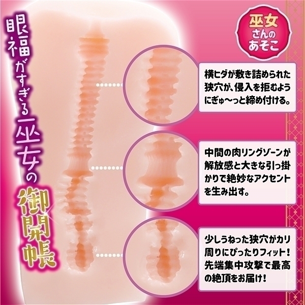 人気を博した御開帳miniシリーズにBIG版が登場!巫女さんのあそこは横ヒダメインのゾリゾリタイプ。小さかったあの子達が大きくなって帰ってきた!あの御開帳miniシリーズが約4倍のサイズにボリュームアップしました。巫女さんのあそこは挿入口から最奥部まで細かい横ヒダで埋め尽くされたゾリゾリ刺激ホール。中間の縦ヒダリングと中央から奥のうねり具合が、横ヒダのシンプルな心地良さにアクセントを加え絶頂へ導きます。非貫通タイプなので奥突き感も存分に楽しめます。