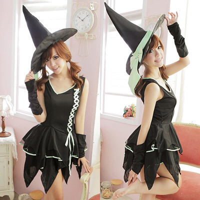 ハロウイン仮装衣装の定番!ブラック×ネオングリーンが可愛いレースアップの魔女ドレスコスチューム。●背面3段ゴム入り・左前のレースアップがセクシーなブラックワンピース。●裾はギザギザ&パイピングのミルフィーユ・4段ティアードでスカートのボリュームUP。●指なしロンググローブ風にも使える黒いアームカバー。雰囲気バッチリ!とんがり帽子の縁にワイヤーを入れてピンッと張りを出しました。※製造時期により材質・レースの柄等が異なる場合がございます。※サイズ表記は実寸となりますので、生地の伸縮等により若干の誤差があります。