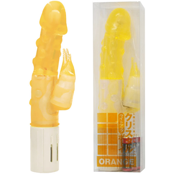 人間工学に基づいた最先端のバイブ「クリスタルボーイ オレンジ」。美しいスケルトンボディは暗闇でも怪しく光り輝き、ムードは盛り上がることマチガイなし!本体の表面の大粒のイボイボに加えて、カリの直径は約3.8cmと存在感抜群!子機にいたっては3枚舌仕様。さらに、スイングとバイブの個別動作が可能…などなど、至れり尽くせりの優秀バイブです。単3電池×3本使用。