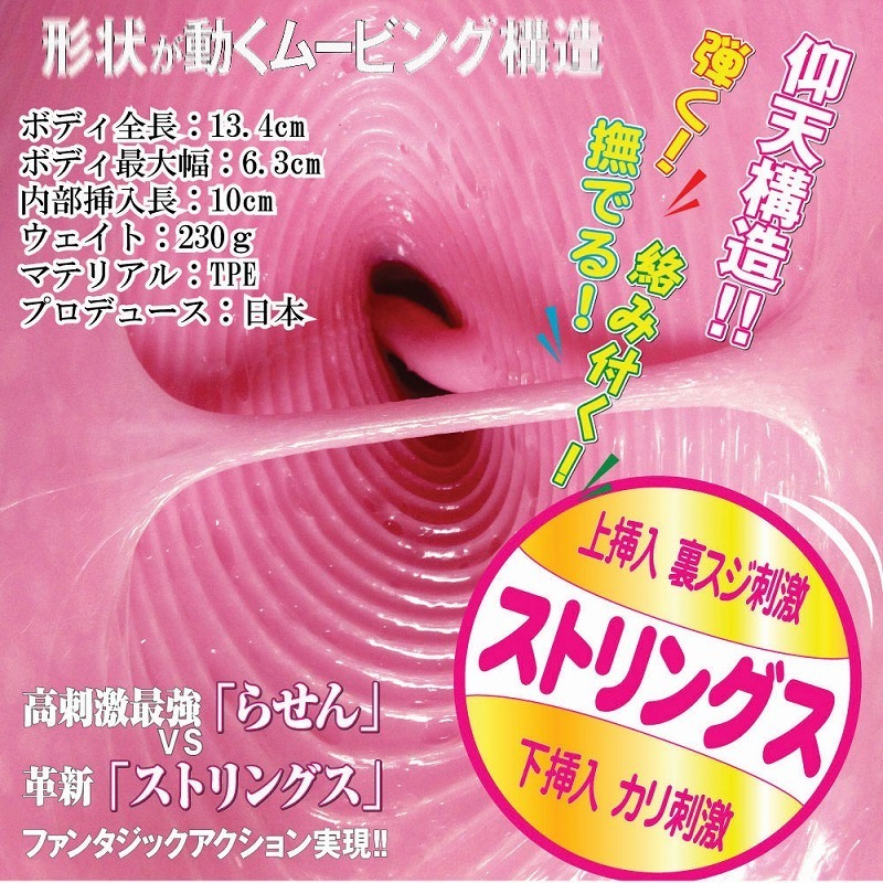 こんなの見たことない!?内部形状にこだわった非貫通型オナホール。形状が動くというムービング構造には、3本のストリングスを使用!内部はヒダとストリングスで出来ていて、挿入時とストローク中に引っかかり気持ちいい!ヒダと素材の相性は抜群で、ゾリゾリ感と絡みつきが病み付きに!ふわふわモチモチ素材で、べた付きや臭いも気になりません。絡み付く、弾く、撫でる、3つの効果が一度に楽しめるオナホールです。