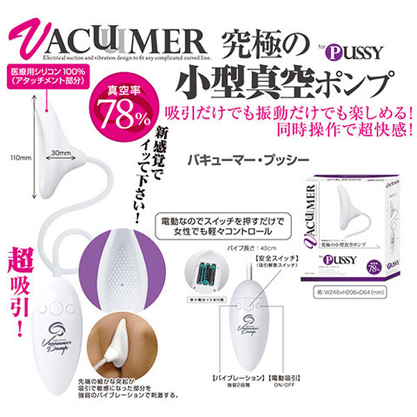 小型ながら凄まじい吸引力!ハイパワーモーターを内蔵したヴァギナ専用吸引ローター。●アタッチメント部は医療用のシリコン素材を採用●滑らかな曲線を描いた形状で女性のアソコをぴったり覆うことが可能●アタッチメントの内側にはツブ状の突起がびっしり●真空率78%のハイパワー吸引●初心者でもすぐ扱えるボタンスイッチ●リモコン左ボタンは2段階のバイブレーション切替え●中ボタンは吸引解除スイッチ●右ボタンは電動吸引のON/OFF●別売りの専用アタッチメントに付け替え可能。パートナーの愛撫では感じられないハードな刺激が楽しめる究極のアイテムです。