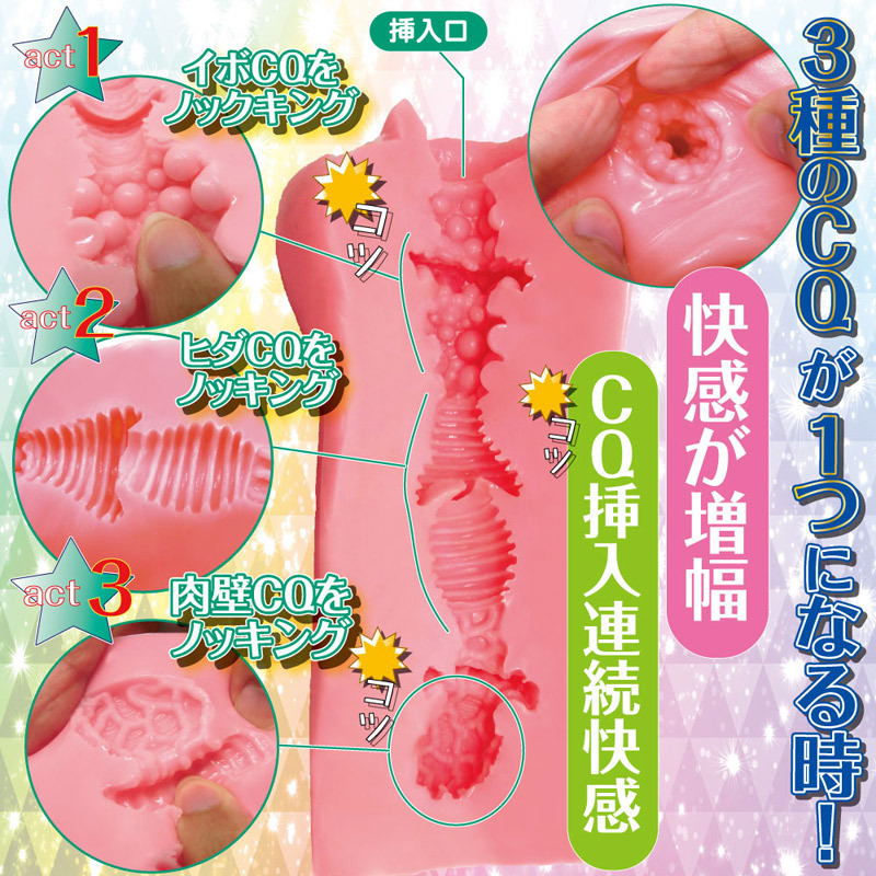 3つのCQ(子宮)を亀頭でノック!異なる快感を一つにまとめたトリプル構造オナホール。●子宮を体感できる「CQ」シリーズ●むちっと高弾力な肉厚ボディ●嫌な臭いを抑えたバンジータッチ素材●イボ・ヒダ・網目ヒダのトリプルCQ構造。亀頭でノックしながら奥へと進む度に新たな刺激が襲い掛かるトリプル構造!柔らかくも高弾力な素材の適度な締め付け感に、何度でもストロークしたくなるオナホールです。