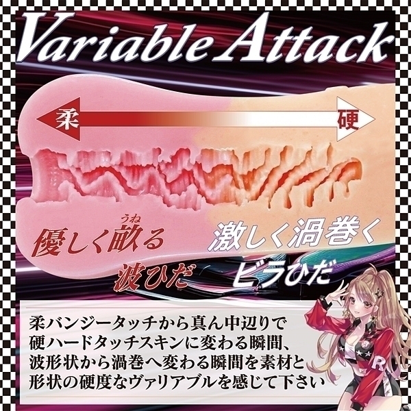 ヴァリアブルアタック:革新の触感テクノロジー、ツートン素材が魅せる感覚のダイナミズム!二つの世界を一つで感じるデュアルフィーリング。柔から硬に変わる瞬間、波形状から渦巻へ変わる瞬間を素材と形状のヴァリアブルを感じて下さい。形状変化が魅せる誘惑からの激情、硬度変化がおりなす心躍るアメージング体感。未知の快感を探求!感触の変遷(へんせん)を是非お試し下さい。