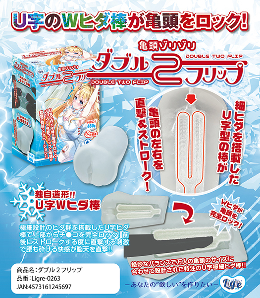 亀頭をダブルのヒダ棒が行き交う!亀頭ぞりぞり「ダブル2フリップ」の登場です!2つの細ヒダを搭載したヒダ棒。亀頭の左右に直撃しながらストロークで、腰も砕ける快感が脳へほどばしる!足腰が立たなくなる程の鋭い快感を実現!前後ストロークするたび、背中が震える・・・最高の瞬殺オナホが登場!絶妙なバランスで万人の亀頭に合わした設計!480gの超肉厚で内部を極細設計により、2つのヒダ棒が亀頭を完全にロック!ズレない!もう逃げられない!滑りだしたら止まらない!感動の快感が今始まる!!