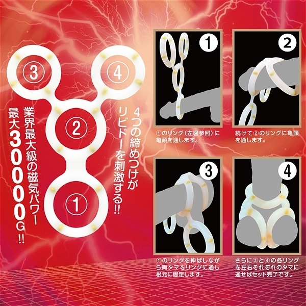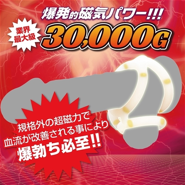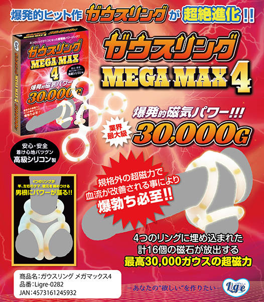 爆発的ヒットなった「ガウスリング」の新作が登場!あのガウスリングを超絶に超えてきた作品!「ガウスリング メガマックス4」が発売です!なんと最高ガウス30.000Gの磁力が爆発!ちなみに、巷にある肩こり解消グッズで平均1300ガウスぐらいですよ。このメガマックス4は30.000ガウスのモンスターリングです!しかもこのガウスを竿、タマ、根本と4つのリングで完全固定し、爆発的なパワーで立ち上げ!!全てのリングに磁石が入っており、男根全体がみなぎるパワーを受けることに!しかもリングの締め付けも相まって、最高磁力、締め付け=爆立ち!!最高の結果へ導くスペシャルなリングなのです!言うまでもなく業界最大の磁力を実現。ガウスリングメガマックス4で最高の勃起力を実現してみませんか!?