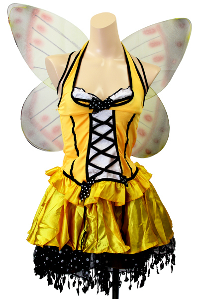 カラフルで大きな蝶々フォルムの羽付き♪セクシー&キュートなミツバチ風のコスプレ衣装。コルセット風の編み上げトップス&ボリューミーな光沢サテンのミニスカートがセットになった上下2ピースタイプ!柔らか素材のホルタートップスはビスチェのようにガーターストラップがついたセクシー仕様!スカート裾にはゆらゆらと揺れるシースルーの飾りをたっぷりON♪羽はゴム&※セット内容以外は付属しておりません。