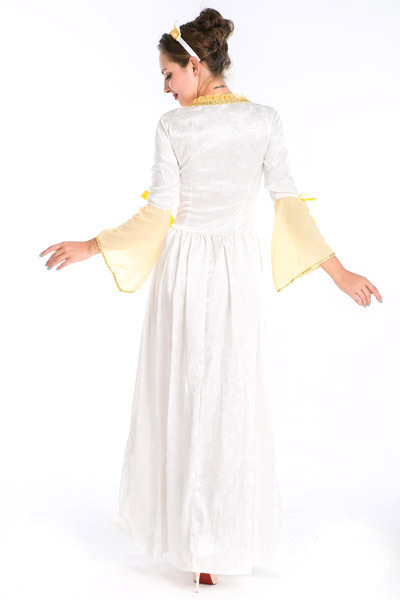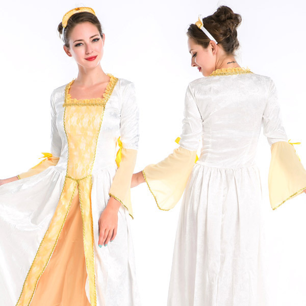 品のあるレースが優雅に舞うルネッサンス調のドレスコスチューム。ホワイトカラーをベースにイエローカラーを組み合わせたふんわりと柔らかな印象のロングワンピースは、上品にフリルが囲うスクエアネックデザイン!スカート部分は重ね着風のレイヤードスタイルでゴージャスに!フレアなラッフルスリーブにはリボンを添えて可愛らしさもしっかり♪ビジュー付きのカチューシャもセットです。※セット内容以外は付属しておりません。