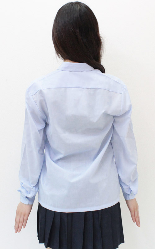 白シャツとは異なる魅力!パリッと着こなしたいサックスカラーの長袖シャツ単品。手持ちの制服コスチュームを、これ1つでマイナーチェンジ!このポケットつきのトップスは、ストレート裾なのでスカートの上に出して着用しても似合います。※水洗い不可、塩素系漂白剤による漂白不可、アイロンは中温で当て布使用、ドライクリーニング可。