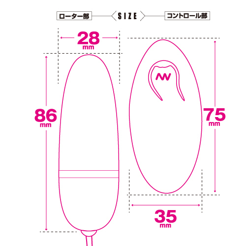 パッケージ:16.5×9.0×5.0cm 本体:ローター8.6×2.8cm・コントローラー全長7.5cm 重量:182g 電池:本体(単四電池×1本使用)、コントローラー(単四電池×1本使用)
