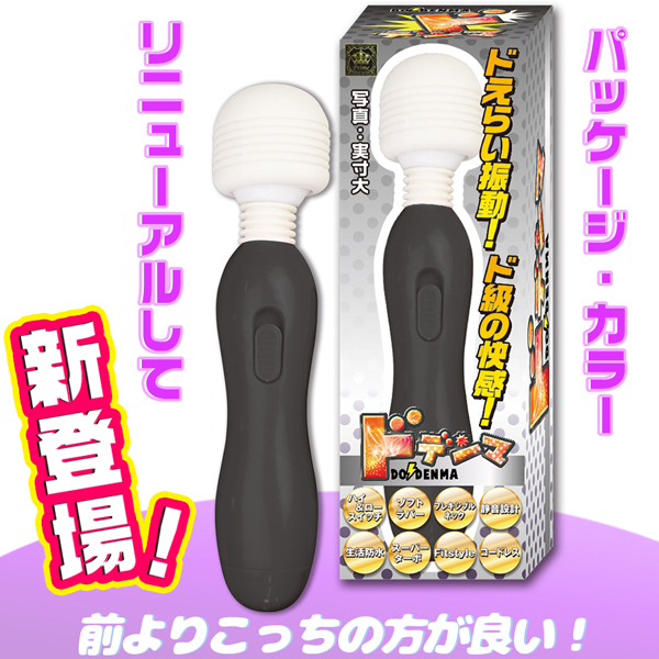 ドえらい振動がドドーンと炸裂!超ド級の握り易さもめっちゃ嬉しいお手軽電マ『ドデンマ』がより可愛いカラーになって新登場!パッケージもリニューアルし、ソフトラバーヘッド&フレキシブルネックだから優しい当て心地です♪耳障りな音をカットした静音設計になっておりスイッチは使いやすい強弱2段階!カラー:ブラック