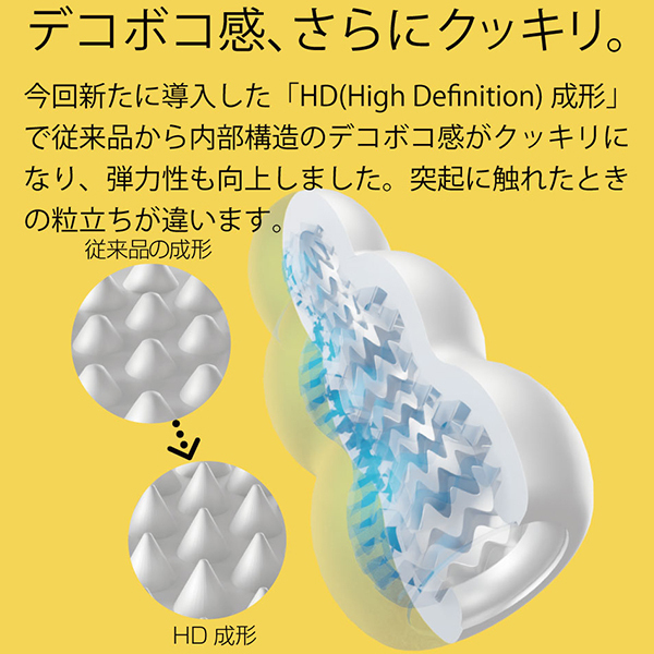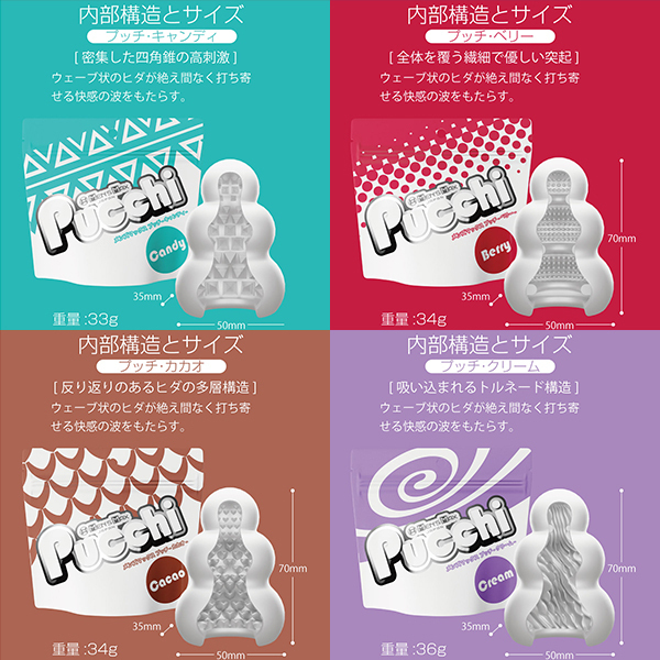 | 全てが新しくなったプッチ。ポケットサイズのローション不要ホールプッチシリーズが生まれ変わって新登場。軟性素材から内部の構造、パッケージ、全てが新しくなりました。デコボコ感、さらにクッキリ。今回新たに導入した「HD(High Definition)成形」で突起のデコボコ感がさらにクッキリになりました。突起に触れたときの粒立ちが違います。弾力感、さらにモッチリ。「HD 成形」により軟性樹脂の弾力性も向上。さらにモッチモチに、しなやかな素材になりました。内部構造も、さらにハッキリ。オリジナルシリーズ、スイーツシリーズ計8種類の内部構造をより精密な造形にリニューアル。「HD 成形」とあいまってデコボコ感がよりハッキリわかる構造になりました。生産工場を一新。新型プッチシリーズは日本国内に新設した工場から生産。最新の設備と厳密な品質管理で一つ一つ丁寧に作ります。ローション不要、必要なのは水だけ。ローション不要軟性素材「プラスウェッチ」水分が付着すると潤い成分が反応、ねっとりした潤いに包まれます。<キャンディー内部構造>「密集した四角錐の高刺激」整然と敷き詰められた四角錘の突起<クリーム内部構造>「吸い込まれるトルネード構造」斜めに擦り上げてくるヒダはクリームのように昇りつめる絶頂感<ベリー内部構造>「全体を覆う繊細で優しい突起」フワフワとした起毛が包み込みまったりしたなめらかな触感<カカオ内部構造>「反り返りのあるヒダの多層構造」ビッシリ並んだヒダは反発しながら複雑に絡みつく刺激 |