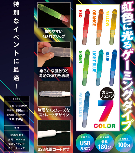 気分も上がるペンライト型ディルド。虹色に光るゲーミングタイプ、映える7COLOR。特別なイベントに最適!ソフトでリアルな触感!!無理なくスムーズなストレートデザインは柔らかな肌触りと満足の弾力を再現、握りやすいくびれグリップ。●メーカー型番:TMT-1739