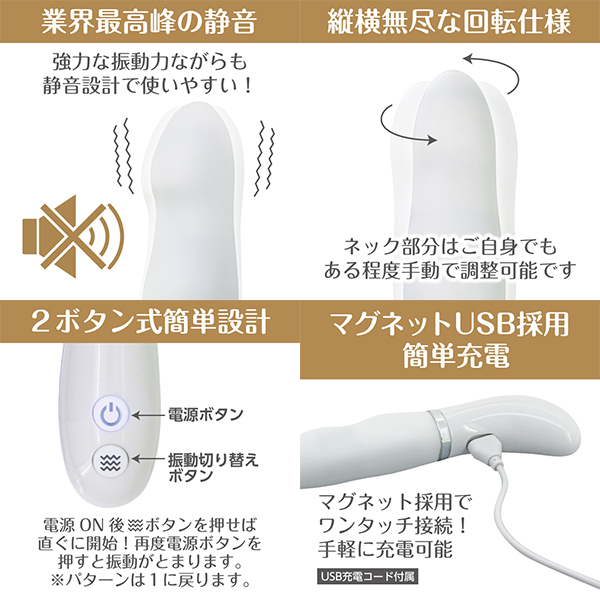 極天シリーズからコンパクトでオシャレな新作登場YUIRA人気ブランド極天シリーズより新たな仲間が登場。スマートでスタイリッシュな見た目とは違った強力静音振動、舌のような滑らかな回転でアナタのオーガズムを最高潮へと導きます。振動しながら舐めるように動くバイブ◎業界最高峰の静音→強力な振動ながらも静音設計で使いやすい。◎縦横無尽の回転仕様→舌のような滑らかな回転。(ネック部分はご自身でもある程度調整可能です。)◎2ボタン式の簡単設計→2ボタン式・コンパクトにする事により簡単操作に。◎多彩なムーブバリエーション→<3種の振動>&<7種のローリング>パターンをお好みで調整できます。◎シリコン素材→可動部シリコン素材採用でデリケートゾーンへの使用も安心。◎マグネットUSB採用簡単充電→マグネット採用でワンタッチ接続。手軽に充電可能です。約50分の充電時間で約90分可動