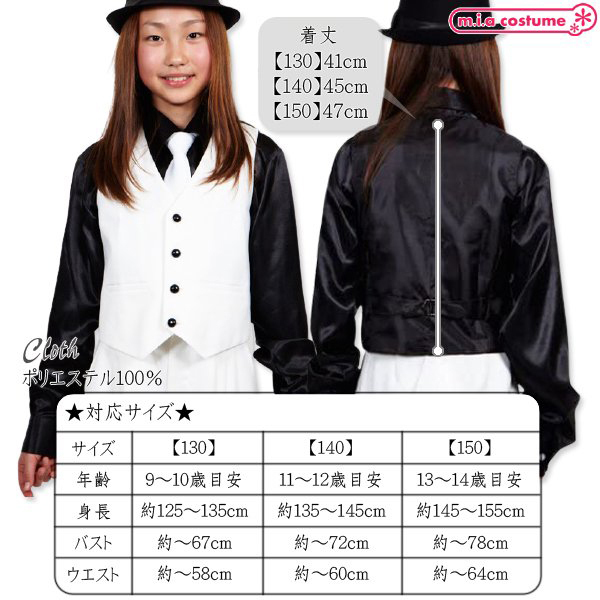 130サイズ 対応サイズ:身長125〜135cm・B〜67cm・W〜58cm 実寸:着丈41cm セット内容:ベスト単品(前ボタン) 素材:ポリエステル100%