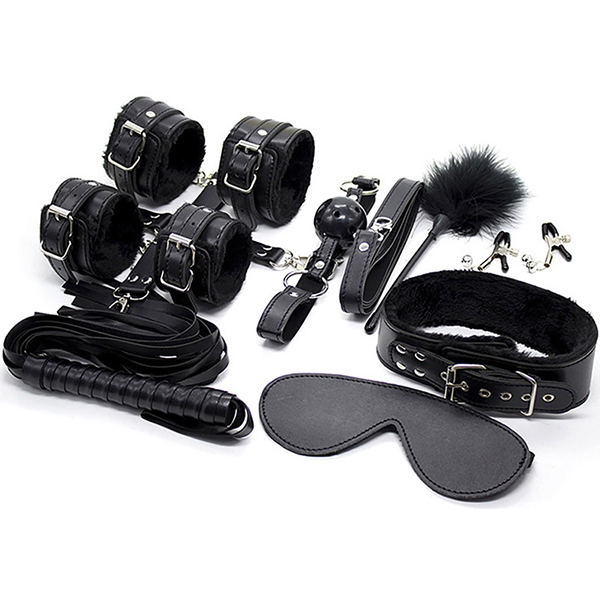 1セットで即SMプレイが楽しめるお得なセット!こちらはクリップやティーザー、手枷と足枷を連結する十字ベルトなどアクセサリーも充実。さまざまなプレイを展開できます、アイマスクや手枷、足枷の裏側はふんわり素材でつけ心地良し。首輪にはリードが付いてより主従関係が明確に。高級感のあるレザー調の質感でムードを壊しません。ブラック