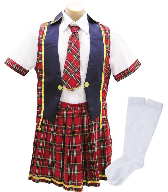 憧れの男の娘に変身!赤チェックが可愛いアイドルコスチュームに、メンズサイズが登場しました。半袖ブラウス、ベスト、ネクタイ、スカート、ソックスの豪華一式セット!これならサイズが合わずに叶わなかった女装にもチャレンジできますね。