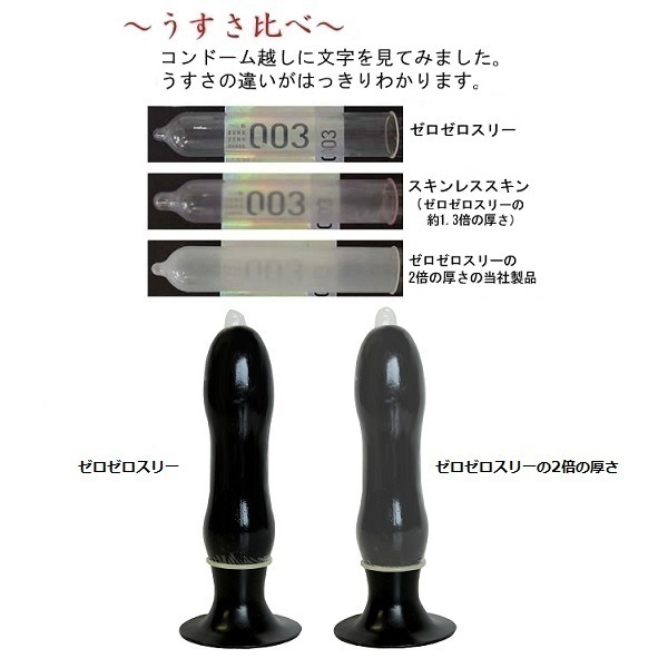 大人気コンドームを低価格で!「ゼロゼロスリー」コンドーム(12個入)。先端から根元まで均一なうすさ0.03mmで、抜群のフィット感を誇る「ゼロゼロスリー」のレギュラータイプ。こちらの商品はパッケージがございませんが、中身はもちろんパッケージ有りの商品と同品質の天然ラテックス製!柔らかく耐久性にも優れた、素肌感覚の自然な装着感を得られるナチュラルカラーのスダンダード形状。パッケージ無しだからこそ実現した、ハイクオリティかつお買い得な商品です。