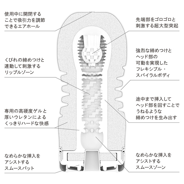 多くのユーザー様の声に応えて更に愛される「TENGA」としてリニューアル!蛇腹からネジのようなスパイラル形状にしたことで、より連続締め付けを体感できるようになりました♪内蔵されていたボールはダイレクトに先端刺激を味わえる大型突起へ変更。硬度の高いゲル&厚みのあるウレタンが、ハッキリとした高刺激な快感をもたらすハードタイプ