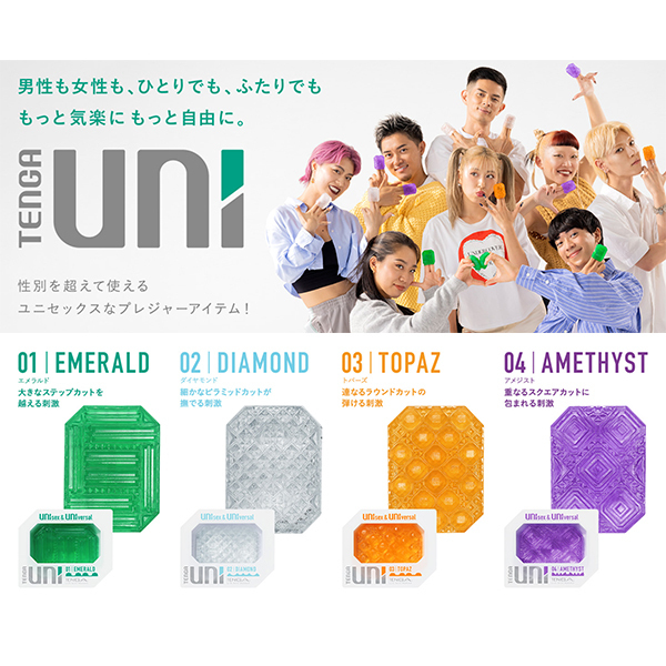 | UNIsex&UNIversal。男性も女性も、ひとりでもふたりでも。性別やセクシャリティにとらわれず、誰でも楽しめる次世代プレジャーアイテム「TENGA UNI」。もっと気軽にもっと自由に、プレジャーライフを楽しもう!TENGA UNIは、ぷるぷるのストレッチ素材で作られているので、指にはめて女性器にあてたり、ひっくり返して男性器を包んだり自由な使い方で楽しめます。また、ひとりで楽しむだけでなくパートナーのために使うこともできるユニセックス&ユニバーサル設計のまったく新しいTENGAです。UNI VARIETY PACK4種類のUNIがセットになったバラエティパック!それぞれ異なる刺激を楽しめます。01 EMERALD [エメラルド]:大きなステップカットを越える刺激横向きに連なった大きなステップディテールによって、乗り越えるような刺激を楽しめます。02 DIAMOND [ダイヤモンド]:細かなピラミッドカットが撫でる刺激均等に並んだ細かなピラミッドディテールによって、繊細に撫でるような刺激を楽しめます。03 TOPAZ [トパーズ]:連なるラウンドカットの弾ける刺激全面に連なったラウンドディテールによって、転がり弾けるような刺激を楽しめます。04 AMETHYST [アメジスト]:重なるスクエアカットに包まれる刺激大小が重なったスクエアディテールによって、包まれ吸い付かれる刺激を楽しめます。 |