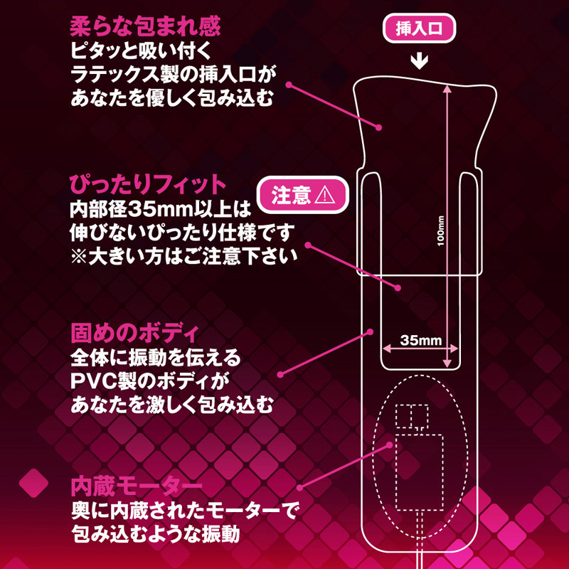 トイズハートのロングセラー電動ホールが進化!柔らかに吸いつくラテックス製のハンズフリーオナホール。●振動を全体に伝える硬めのPVCボディ●ピタッと密着するラテックス製の挿入口●サオの根元まで包まれる吸着感●最奥に8段階振動モーター内蔵●リモコンで簡単に操作可能。ピタッと吸いつくように包み込むラテックス独特の挿入感を生む至高の電動オナホール!設計上、最奥部の内径は35mmまでとなりますのでご注意ください。