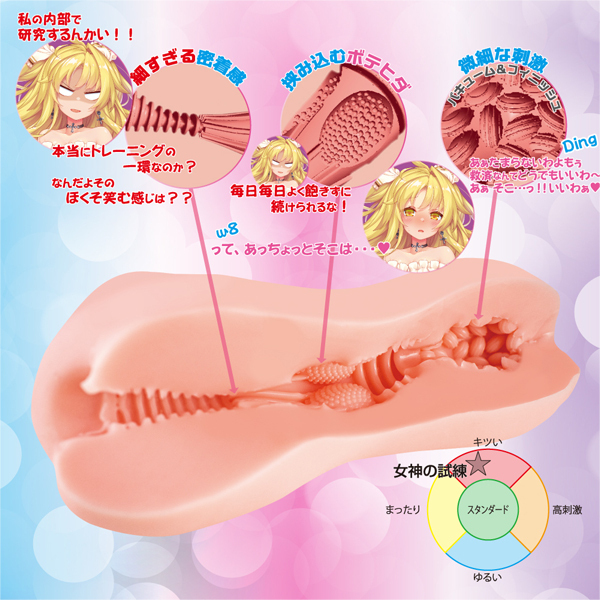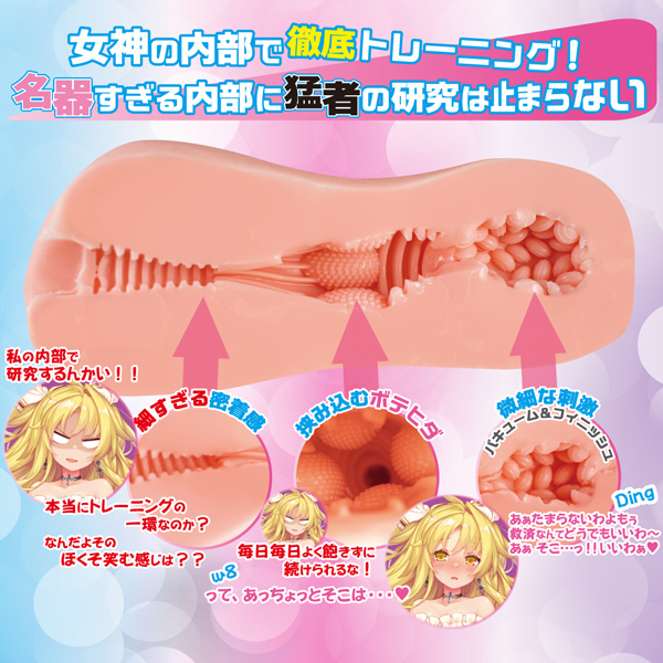 可愛い女神の美麗イラストパッケージが特徴の非貫通オナホ。女神のアソコはやっぱり神級!?狭く細い穴を押し進むと粒々のボテヒダが挟み込むようにプレス。更に最奥にはアーモンド状のイボが密集し、繊細な刺激を加え追い打ちをかける!素材には嫌な臭いやベタつきを軽減した人肌質感のヒトハダマテリアル使用。ローションを馴染ませることで質感が変化する!日本製、重量290g