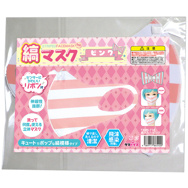 顔にピタッとフィットする伸縮性抜群の可愛い縞パン風立体マスク(ピンク)。白×ピンクのキュートでポップなカラーリングが魅力!センターには小さな白リボンをあしらいアクセントをつけています。洗って繰り返し使えるため衛生的で経済的♪コスプレ衣装やアニコス衣装と組み合わせて使えるラブリーな縞マスクです。ウイルス対策、風邪予防、飛沫感染防止に◎●メーカー型番:TAMS-719