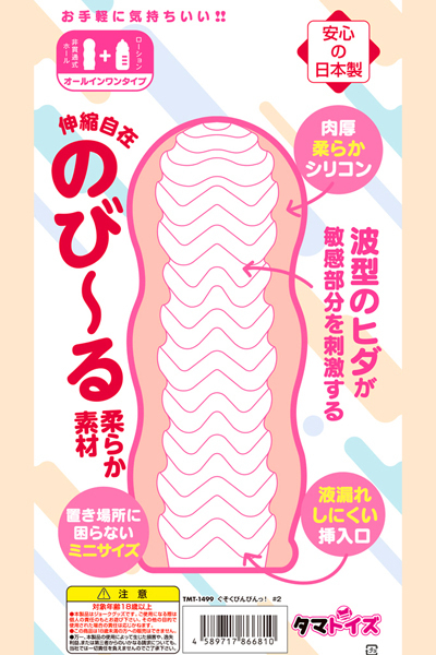 手軽に使える携帯タイプ♪肉厚柔らかシリコン使用!ウエーブタイプで波型のヒダが敏感部分を刺激する非貫通オナホール!伸縮自在の、のび〜る柔らか素材なのに、液漏れしにくい挿入口!舐めても安心・安全な日本製のローション付きのオールインワンオナホ。●メーカー型番:TMT-1499