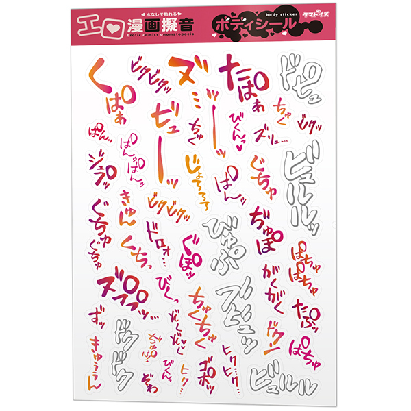 エッチをするときの様々な擬音がエロいフォントで身体に貼れるシールになりました♪「エロ漫画擬音ボディシール」。水なしで貼れるので使いたいときにスグに貼れる!パートナーの身体に卑猥な擬音文字を貼り付けて妄想が捗る擬音プレイに♪跡が残らず簡単に剥がせるのでプレイとシンクロしながら興奮し、プレイの後も処理は簡単。本品はジョーク商品です。その他の目的で使用された場合の責任は応じかねます。●メーカー型番:TMT-1544