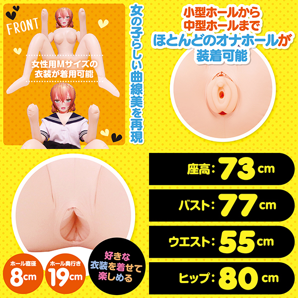 アニメチックな彼女召し上がれ?抱きしめたくなるキューティーBODY 萌え系エアドールの決定版!可愛らしい2次元プリントエアドールは抱き心地抜群!女の子らしい曲線美を再現し女性用Mサイズの衣装が着用可能のため好きな衣装を着せて楽しめる!ハメやすい究極のポージングは対面立位や正常位がしやすい実用的なデザイン。小型ホールから中型ホールまでほとんどのオナホールが装着可能。イラスト:どぅーゆーうぉんとぅー●メーカー型番:TMT-1605※衣装は付属しておりません。