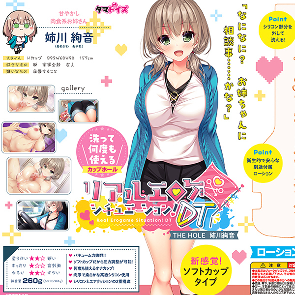 リアルエロゲシチュエーション!DT公式コラボ商品。新感覚!ソフトカップタイプ。ソフトカップだから圧力調整が可能!シリコンとエアクッションの2重構造。シリコン部分を外して洗える!ローション付き。●姉川絢音
