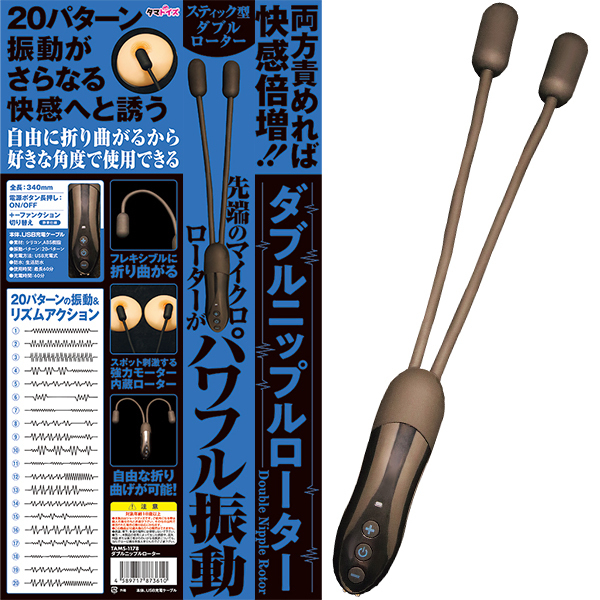 ダブルローターで同時攻略!スティック型ダブルローターはフレキシブルに折り曲がり、自由な折り曲げが可能! 両方責めれば快感倍増!!自由に折り曲がるから好きな角度で使用できる。先端のマイクロローターがパワフル振動するスポット刺激する強力モーター内蔵ローターは20パターン振動がさらなる快感へと誘う。●静音仕様●振動パターン:20パターン●生活防水●使用時間最長60分、充電時間60分●メーカー型番:TAMS-1178