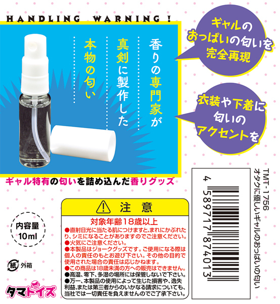 ギャル特有の香りを完全再現したアトマイザータイプの匂いフェチグッズです♪香ばしさとフローラル香が程よくミックスされ、リアルな匂いを楽しむことができます!香りの専門家が真剣に製作した本物の匂いで、女性フェロモンたっぷりの淫臭が特徴です♪オナホールやラブドール、抱き枕などと一緒に使うことで、より臨場感のあるプレイを楽しめます!衣装や下着に吹きかけると、匂いのアクセントになり、さらに楽しみが広がります♪プッシュタイプの香水として使いやすい設計で、匂いを嗅ぐだけでも楽しめますが、色んなシチュエーションで活用することで、よりリアルな体験が可能です!内容量は10mlで、持ち運びにも便利なサイズ♪あのとき感じた匂いをもう一度楽しんでください!●メーカー型番:TMT-1756