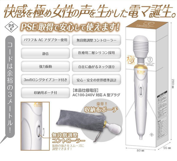 人気AVメーカーから発売された電マで、そのパワフルさには電マユーザーも満足の一言です。操作はダイヤル式でとっても簡単♪無段階調節により、微細振動から身体を貫くような激しい振動までコントロールが可能!コンセントタイプの電源だから安定した電力供給を受けられ、パワフルさを失うことなく使用していただけます。3mのロングコードなので場所を選ぶこともありませんし、医療用二層シリコン採用のヘッドは45度の角度まで軽々と曲がる柔軟さで、どんな体勢でも自由度の高い当て方で楽しめます♪電マといえば気になる静音機能ですが、こちらはテレビなどの生活音に紛れ込ませられるほどの静けさ。電マの中では比較的静かな方ではないでしょうか?ただしパワフルさが売りの商品のため、床に置いたりすると振動が響き渡ることもありますので置き場にはご注意ください。付属品として本体を収納できるポーチがついていますので清潔に保てます♪