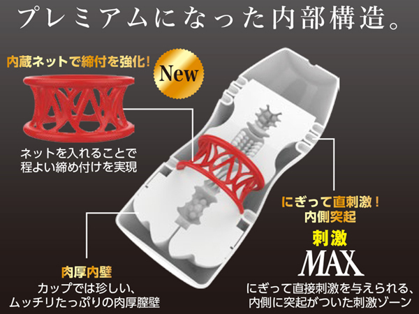 肉厚な入口がリアルな挿入感を与える「ユイラシコルプレミアム(ムーンライト)」。前モデルに比べフィルムの耐久性アップ!破れにくく安心して強く握りしめられるようになりました♪また、内部にはネットリングを内蔵し締め付けを強化!そのまま使っても良いですが、外側から握って圧力をかけることで内側に設置された突起の刺激をよりお楽しみいただけます。ローション付