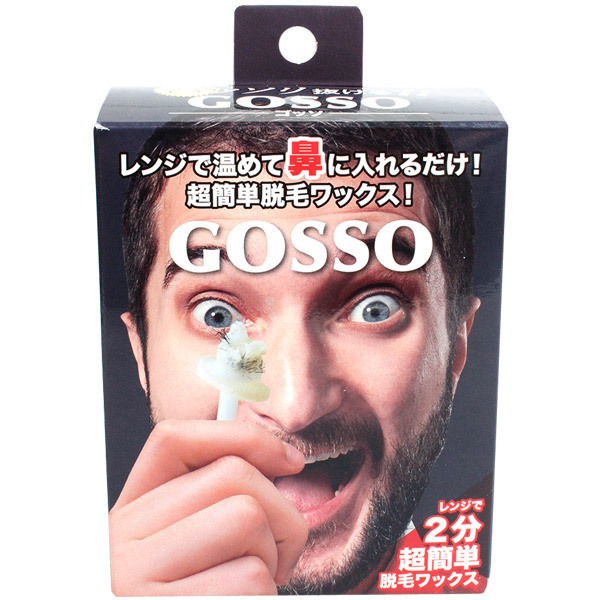 鼻毛処理に新革命!ゴッソリ抜ける最強の鼻用脱毛ワックス「GOSSO(ゴッソ)10回分キット」。●一気に抜ける超簡単な鼻毛脱毛セット●レンジで温めて鼻に入れるだけ●ブラジリアンワックス(40g)●専用スティック20本(両鼻10回分)●耐熱カップ1個・紙カップ3個●取扱い説明書付属。気になる鼻毛と一瞬でオサラバ!美容業界で大注目のブラジリアンワックス脱毛を取り入れた鼻毛処理グッズ。使い方は耐熱カップの中に水を入れ、その上から紙カップを入れてワックスをレンジで温め、スティック先端に溶かしたワックスを適量巻きつけたら鼻にイン!完全に固まったら引き抜くだけという簡単仕様。スティックの約1cm部分にはストッパーが付いているので必要な鼻深部の鼻毛はそのまま残せます。ポイントは躊躇せず一気に引き抜くこと!真下に勢いよく引き抜くことで痛みも最低限に抑えられます。残ったワックスはフタを閉めて保管可能です。※画像4枚目は旧製品の為、紙カップが5個になっていますが実際の商品は3個となります。